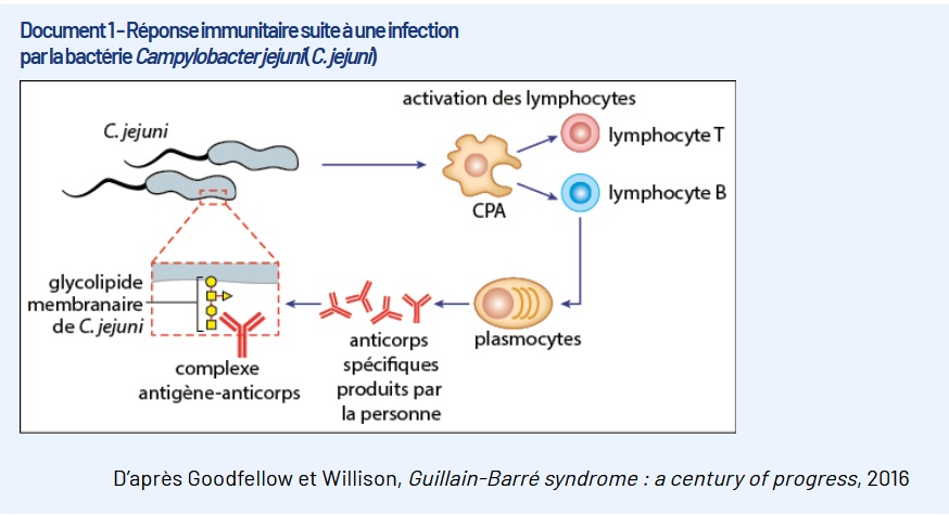 La réaction immunitaire au C. jejeuni dans l'organisme humain aboutit à la production d’anticorps spécifiques : un antigène bactérien d'un glycolipide qui est un des constituant de C. jejuni. Ces anticorps se lient aux glycolipides membranaires bactériens (formation de complexes antigène-anticorps). Les lymphocytes B et T s'activent